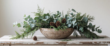 AI Generated. Cozy Holiday Decor Featuring Fresh Greenery and Pine Cone in a Natural Wooden Bowl on Rustic Table