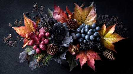 A stunning floral composition featuring a mix of autumn leaves, colorful berries, and rustic pinecones arranged beautifully on a dark background. Perfect for seasonal decor.