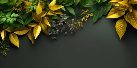 A vibrant display of lush greenery and colorful flowers set against a textured dark background, perfect for minimalist decor and botanical aesthetics.