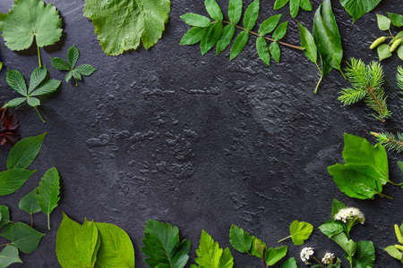Green fresh forest tree leaves flowers are laid out on dark concrete background. Nature pattern texture for design template mockup. Floral plant wallpaper. Ecological lifestyle. Copy space for text.