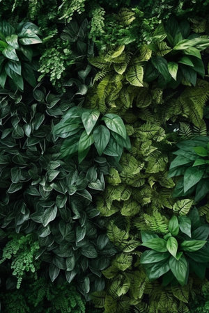 Dense vertical garden with vibrant foliage, soft sunlight creating a serene atmosphere
