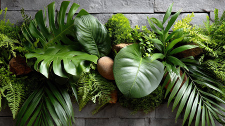 Experience the calming effect of lush green foliage displayed against a textured stone wall, perfect for enhancing indoor garden aesthetics and tranquility.