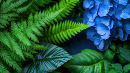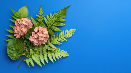 Colorful composition of rose-gold, green fern, and hydrangea over royal blue
