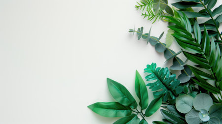 This image features a variety of green leaves and ferns artistically arranged on a plain background, highlighting natural beauty and organic designs.