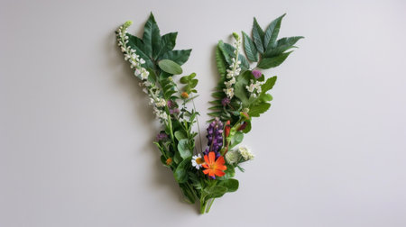 An artistic arrangement of fresh flowers and lush greenery forming the letter V. This vibrant display captures the essence of nature's beauty and elegance.
