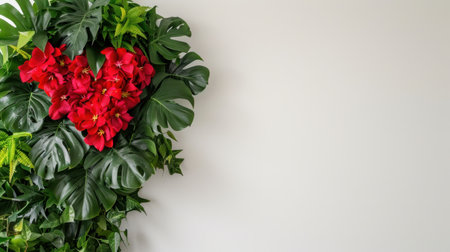 This captivating image features a heart-shaped arrangement of vibrant red flowers surrounded by lush green leaves against a neutral wall. Perfect for themes of love and nature.