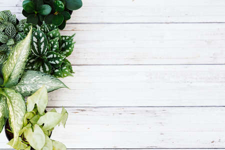 Green plants and succulents on the white vintage table.