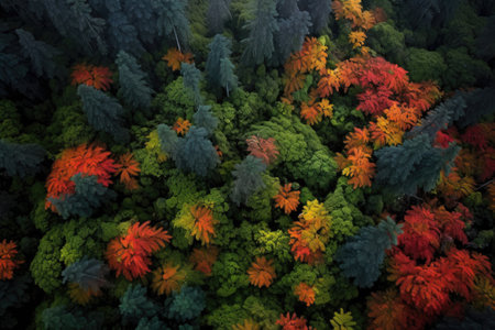 A lush forest from above, showcasing an array of trees in vibrant autumn colors. Shades of green, red, yellow, and orange create a breathtaking tapestry of nature.