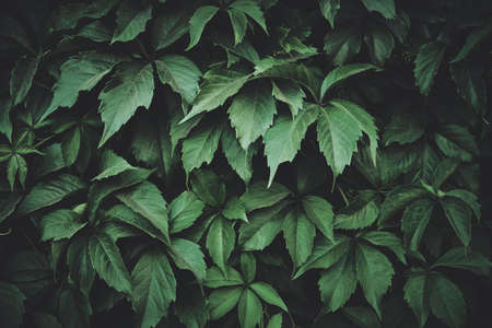 Green leaves background in low key. Green foliage texture, toned