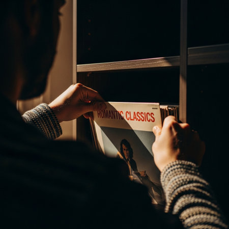 Over-the-shoulder view of a hand selecting a vinyl labeled 'Romantic Classics' from a sunlit shelf.