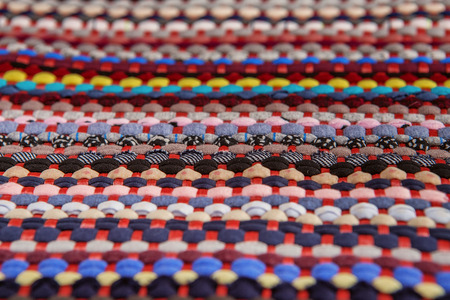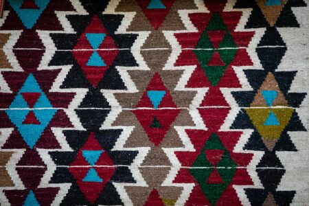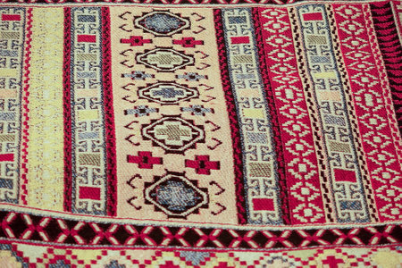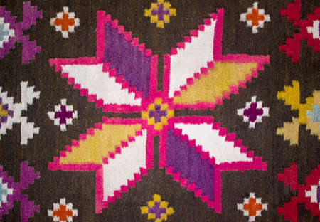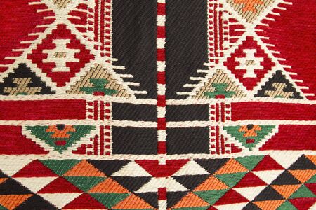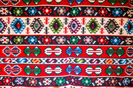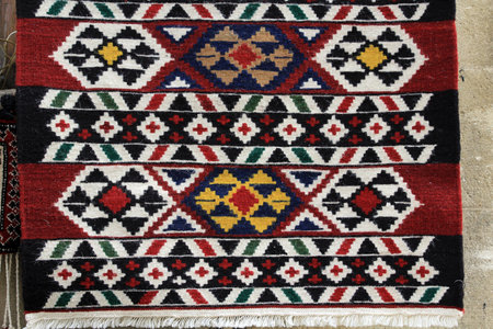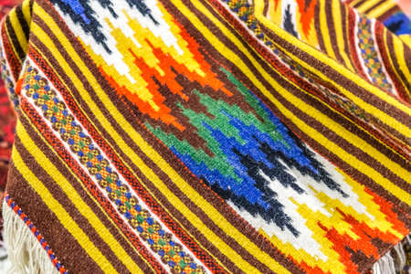 Traditional Albanian bright colorful woolen woven pattern rug handmade in the street market, close up.