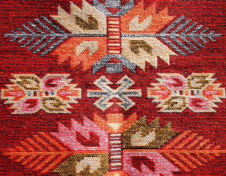 Fragment of antique handmade carpet, Crafts. Woven wool carpet .Folk art.Close up of geometric patterned carpet. Hand woven rug with red, yellow, blue and other colors. Hand woven carpet with abstract design. Colorful carpet. Textile background. Abstract background.