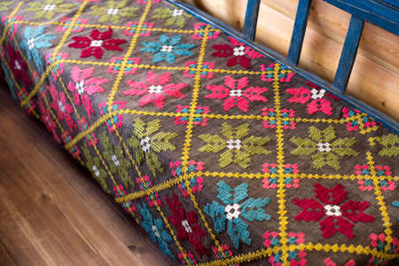 Traditional Slavic ancient embroidered bedspread. Ethnic Ukrainian or Belarusian pattern on the fabric.