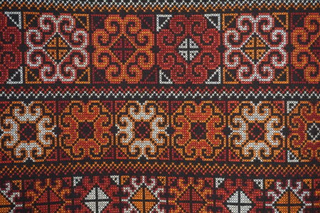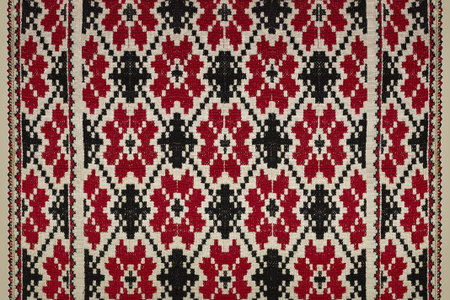 Ukrainian national cross-stitch embroidery. Background embroidered red and black patterns close-up