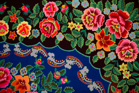 Hand-embroidered Yao Mien embroidery textile with colorful patterns, traditional tribal textile craft, intricate needlework, perfect for backgrounds, designs, and cultural art projects.
