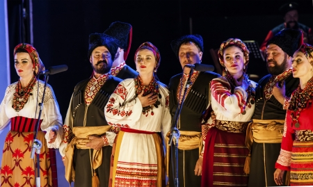 UKRAINE, LUGANSK - MARCH 18, 2014 Ukrainian National Folk Dance Ensemble named After P Virsky, who is considered best folkloric ballet dancer in country, performed a live show on stage in Lugansk
