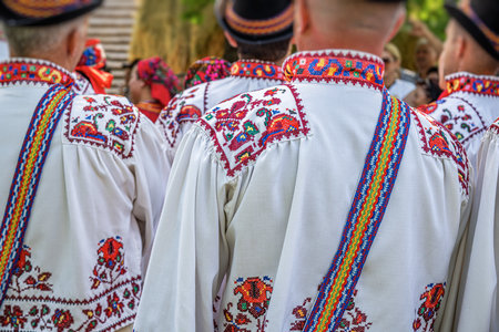 Details with the traditional Romanian clothing of a young woman and man.