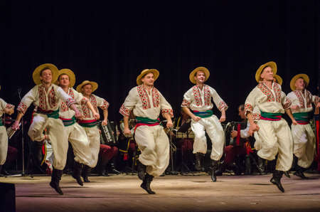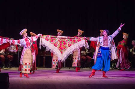 DNIPRO, UKRAINE - NOVEMBER 7, 2018: National traditions, customs and rites of the Ukrainian people performed by members of the Folklore Ensemble SLAVUTYCH at the State Drama Theatre.