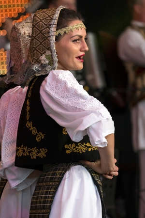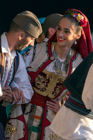 Young girls from Serbia, in traditional specific costumes, attended at a international folk dance festival