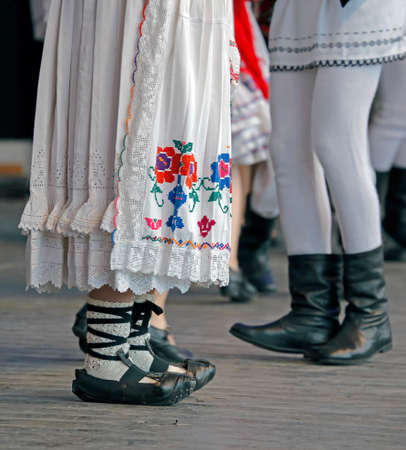 Feet of dancers and clothes in traditional Romania folk dances.