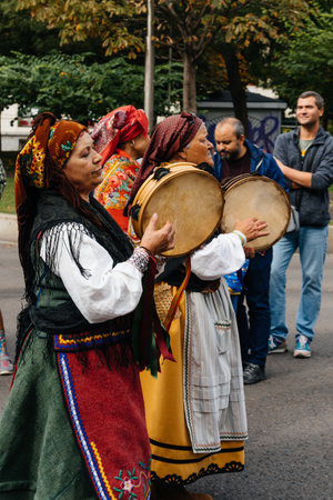 Bucharest, Romania - March 5, 2020: Senior women and men, dressed in Romanian traditional clothing, dance at a festival.