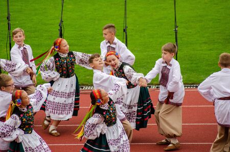 Slavuta, Ukraine - September 22, 2019: Ukrainian girls and boys in national costumes take part in the Ethno-eco festival Kolodar in city Slavuta, Ukraine