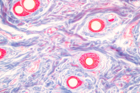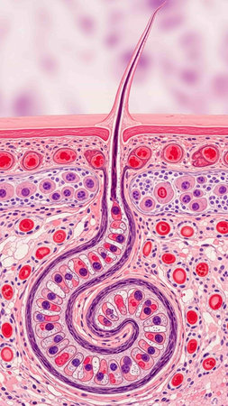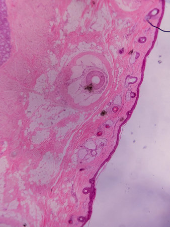 A microscopic view of skin tissue showing various layers and structures, with a focus on cellular details and staining patterns