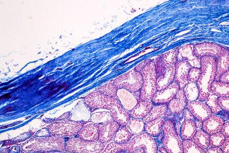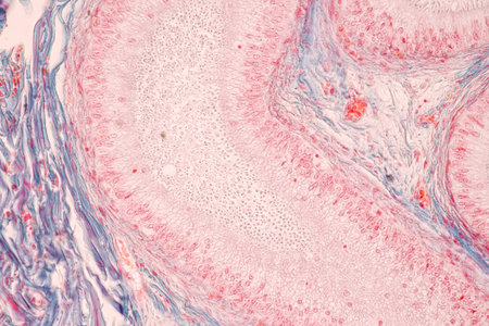 Detailed observation of a human arterys cross section showcasing colorful layers and cellular structures in a laboratory setting.