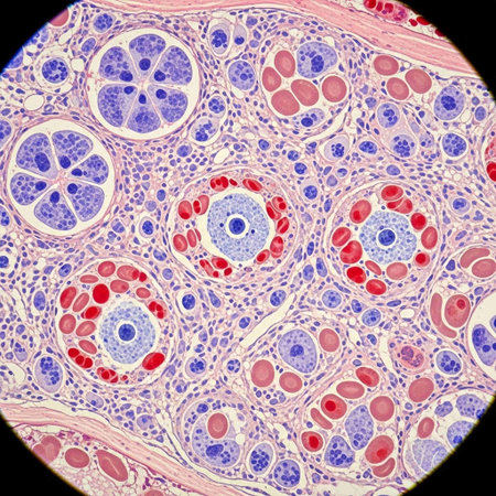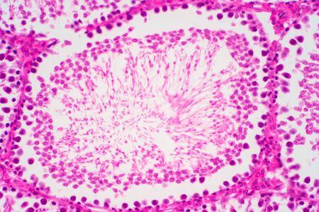 Cross section Human testis under microscope view. Shows spermatogonia, spermatocytes in meiosis, spermatids, and spermatozoa