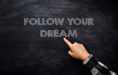 the girl's hand points on a black chalk board to the inscription follow your dream