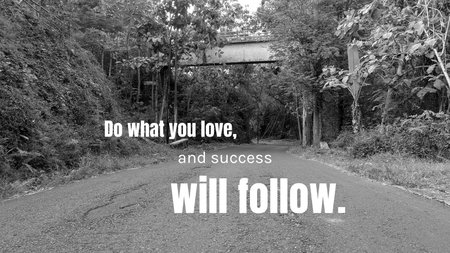 A black and white image of a road with a motivational quote. The text reads, "Do what you love, and success will follow." The quote is in white font, varying in size.