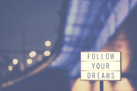 Follow Your Dreams inspirational life quote text in lightbox, city lights in background, color toned picture.