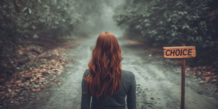 A low-angle view captures a person's legs and boots traversing old railway tracks covered with fallen leaves, leading towards a foggy forest, with the numeral 2026 marking the path ahead.