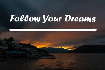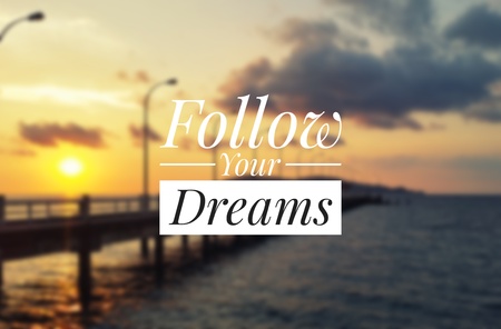 Inspirational quote - Follow your dreams. Blurry sunset background.