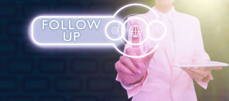 Handwriting text Follow Up. Business approach Additional info or any activity that needs to check secondly Businessman in suit holding tablet symbolizing successful teamwork.