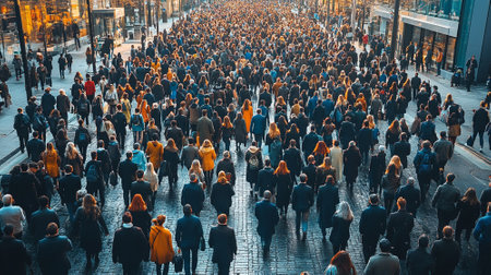 People walking at city street, aerial view. Protesting crowd. Generative AI