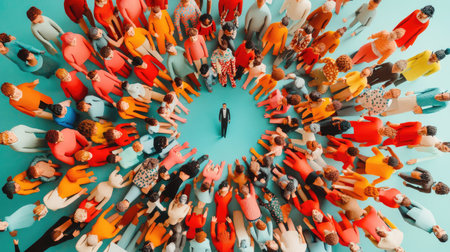 A stunning aerial view of a diverse crowd surrounding a single figure, showcasing unity, individuality, and vibrant colors in a modern artistic design.