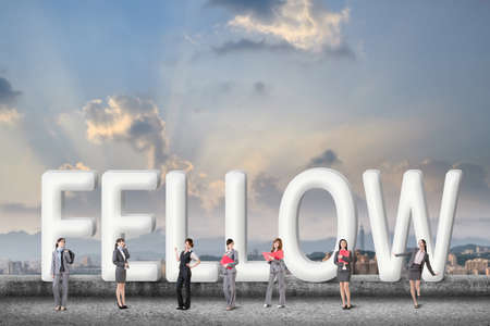 Concept of partner, friends,collaborate with group of business people stand with 3d text.