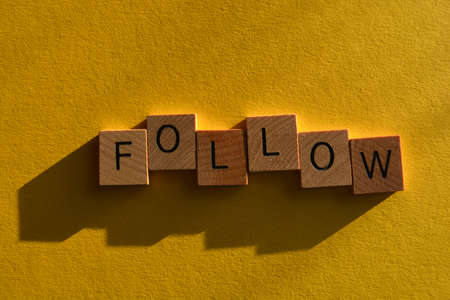 Follow, word in wooden alphabet letters isolated on bright yellow background with copy space