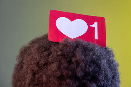 Closeup of anonymous unknown person with Afro hairstyle posing with blogger heart on his head, emoji counter, follower notification. Indoor studio shot isolated on colorful neon light background.