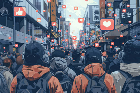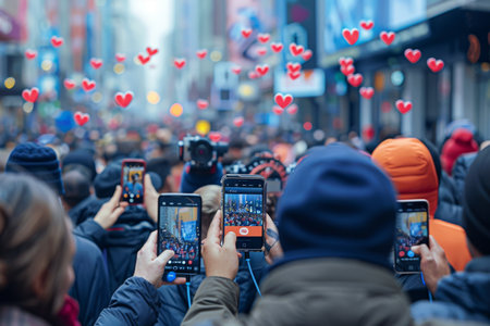 A crowd of people watching live streaming from smartphones on a city street.