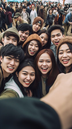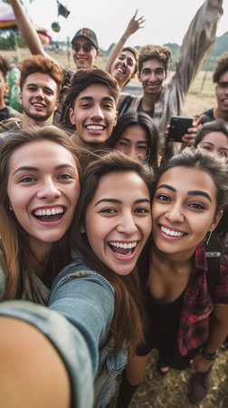 Generative AI : Big group of friends taking selfie picture smiling at camera Laughing young people celebrating standing outside and having fun Portrait photography of teens guys