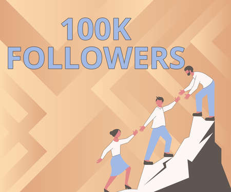 Handwriting text 100K Followers. Word for number of individuals who follows someone in Instagram Colleagues Climbing Upwards Mountain Reaching Success Presenting Teamwork.
