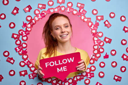 female holding FOLLOW ME sign background.