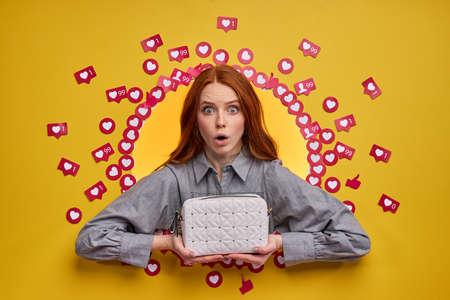 funny excited female reviews new bag, distributes tips to subscriber audience