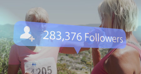 Image of social media notifica over happy senior women resting after marathon on beach. social media, fitness, healthy retirement and communication network concept, digitally generated image.