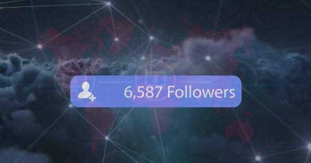 Image of number of followers increasing over connecting the dots, circles against clouds. Digital composite, global communication, social media, technology, cloud computing, data, growth.