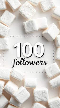 Celebratory milestone of reaching 100 followers surrounded by marshmallows on a light background