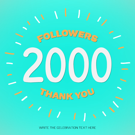 Vector illustration with white digits 2000 and orange text Thank You Followers on blue-green background. Template card for celebrating many followers in social networks, social media post. 2k subscribers.