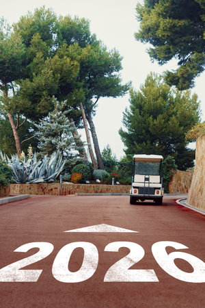 An asphalt road stretches towards the horizon, marked with the year 2026. The scene is bathed in the warm hues of a sunset, casting long shadows. This image depicts a conceptual journey or future aspirations. Suitable for various projects, including editorial features and visual content for commercial applications.